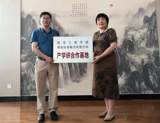 在中国服装(中南)校服研发中心——湖南旭荣制衣有限公司,副总经理蔡建红介绍了公司在我国校服行业领域中的优势与地位和公司的发展规划,并就当前企业发展中急需突破的一些瓶颈进行了深入交流;总经理谢荣介绍了校企双方目前在校服领域合作所取得的成绩,表达了进一步与388vip太阳集团在产、学、研各方面进行全面、长效、深化合作的意愿。会后,易兵与公司总经理谢荣共同为产学研合作基地揭牌。