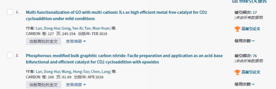 388vip太阳集团兰东辉博士在碳材料功能化方面的研究工作引起了同行专家的广泛关注,其在碳材料顶级期刊《Carbon》(SCI一区,IF=7.42)上发表论文4篇,其中2篇论文被遴选为ESI高被引论文(高被引论文是指在同年度同学科领域中被引频次排名位于全球前1%的论文)