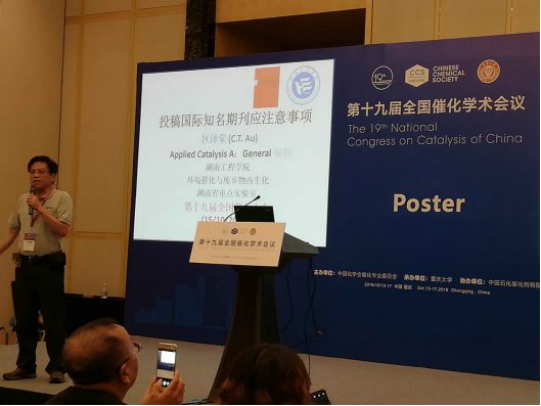 10月13-17日,由中国化学会催化委员会主办,重庆大学承办的第十九届全国催化学术会议在重庆召开。388vip太阳集团特聘教授区泽棠和兰东辉博士受邀参加了此次会议,区泽棠教授在专题研讨会上作了题为《投稿国际知名期刊应注意事项》的专题特邀报告并主持了分会场报告。