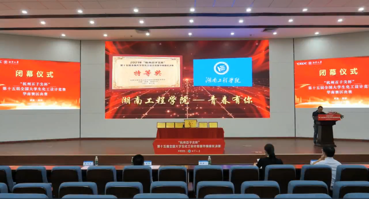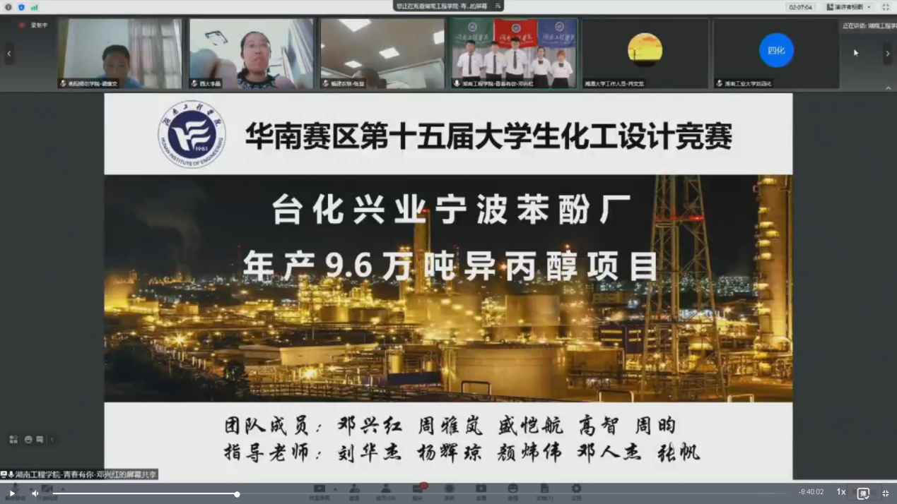 第十五届全国大学生化工设计竞赛华南赛区决赛由中国化工学会、中国化工教育协会主办,湘潭大学承办,是国内化工类级别最高、参赛队伍最多、影响最大的比赛。此次比赛吸引了华南赛区61所高校的219支队伍报名参赛,通过线上方式举行,并向全网直播,2.57万余人观看了直播。本次竞赛旨在培养大学生运用所学知识解决实际问题的能力、创新能力、语言表达能力以及团队协作精神,实现“卓越工程师教育培养计划”,同时为增强各高校之间的学术交流和提高教学质量搭建一个良好的平台。