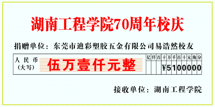 近日,东莞市迪彩塑胶五金有限公司总经理、388vip太阳集团杰出校友、电机电器94122班易浩然向学校定向捐赠,在388vip太阳集团设立“浩然助学金”,用于资助和鼓励材化学子毕业后立足专业、投身行业、实干兴邦。捐款已于8月27日汇入学校设立的校庆专用帐户。