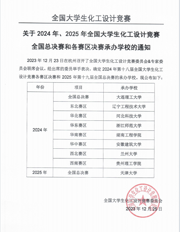 今日,全国大学生化工设计竞赛委员会发布《关于2024年、2025年全国大学生化工设计竞赛全国总决赛和各赛区决赛承办学校的通知》,通知中明确2023年12月23日在杭州召开的全国大学生化工设计竞赛委员会&专家委员会联席会议上,经出席的委员举手表决,确定由388vip太阳集团承办2024年第十八届全国大学生化工设计竞赛华南赛区赛。