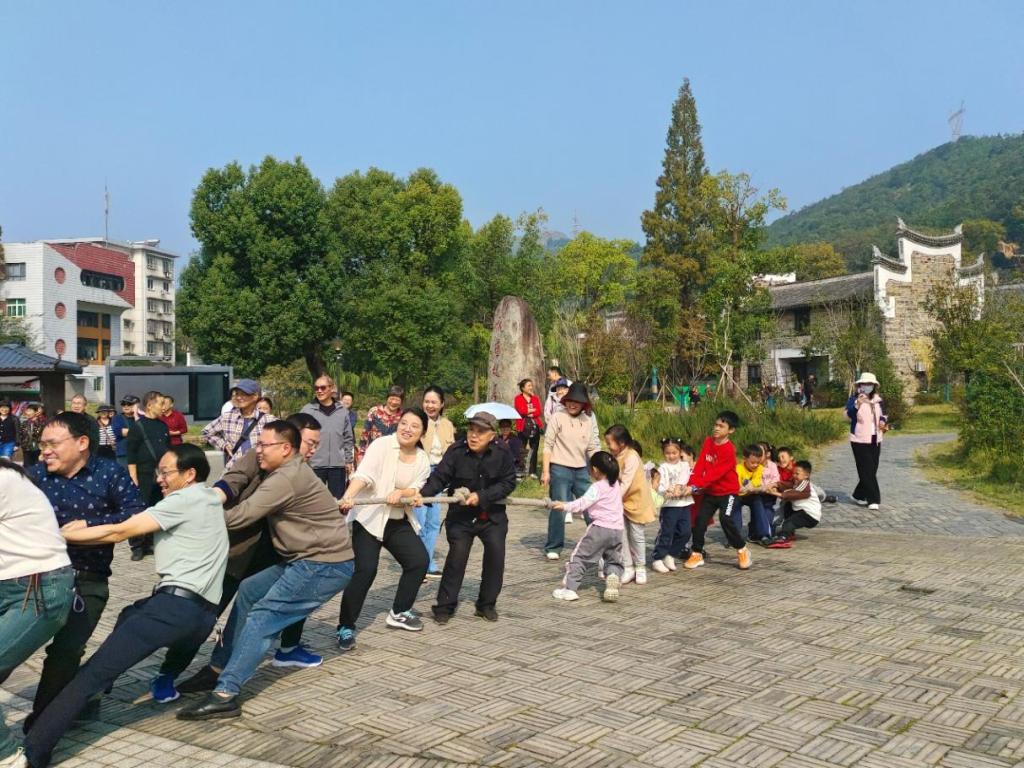 随后,在故居广场上举行了紧张而激动的拔河比赛。随着比赛哨声响起,队员们紧握绳索,脚跟抵地,身体后倾,全力以赴。加油声此起彼伏,场面异常火热。