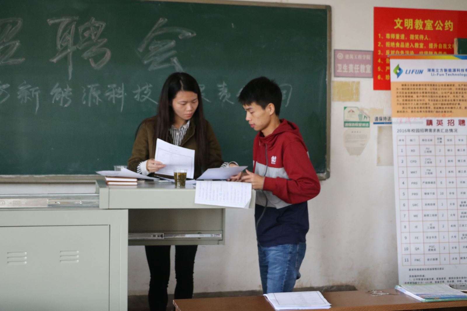 11月3日下午2:30,湖南立方新能源科技有限责任公司在388vip太阳集团四教609举办招聘会。参与此次招聘会的有该公司的招聘主管杨松和人事主管李菊芳以及应届大四毕业生。此次招聘主要面向有关化学方面的多个专业。