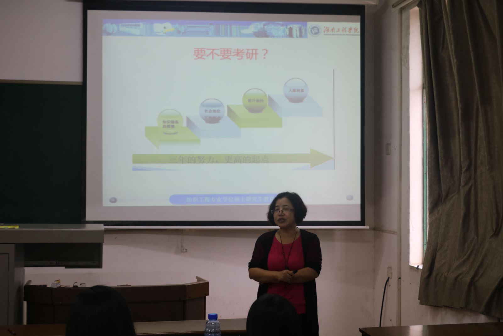 会议伊始,陈建芳副院长向大家简单介绍了2018年研究生考试的报考流程,并向同学分析了近几年的考研形势,同时提醒同学们在报考学校时要对自己有准确的定位,填报前需要预先了解报考院校,不要盲目跟风。随后,陈建芳副院长向大家介绍了化学化工学院的优秀校友,以此激励大家。紧接着,陈院长着重向同学们介绍了本院学生报考本校纺织工程方面的研究生招生的相关奖励政策,通过副院长的细致介绍,大家了解到纺织工程是本校历史最为悠久的专业,其地位在全国也排名前列,同时本校纺织工程专依托于企业是为企业培养特需型人才,因此研究生毕业以后就业十分方便。并且,陈建芳副院长还特别提出,学院也有意招聘在本院就读的优秀研究生留任老师,学办易苏老师便是学院研究生毕业后留任老师。最后,易苏老师上台以自身经历来鼓励同学们积极报考研究生。