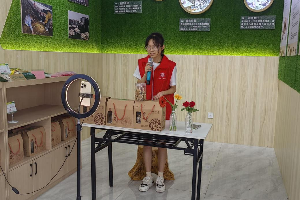 7月13日,实践团来到韶山银田镇银田村乡村振兴产业基地开展助农直播。志愿者们热情洋溢、轮番上阵向广大网友介绍基地概况、产品特色,与直播间网友们积极留言互动。志愿者在基地工作人员的引导下,带领直播间的网友们实地参观了蘑菇种植大棚,展示菌类的生长环境、种植方法,了解关于蘑菇、灵芝等菌类的一些基本知识,如生长周期、生长习性、种植技术等。