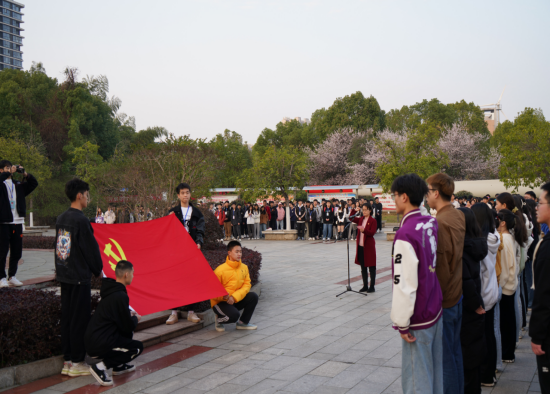 严明带领学生党员进行党旗下的宣誓。全体学生党员列队面对党旗,保持立正姿势,举右手握拳过肩,在领誓人逐句领读下,齐声跟读誓词。