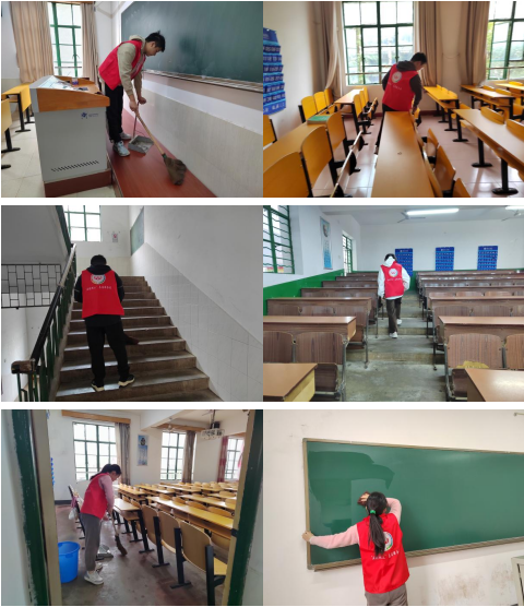活动开始前,全体志愿者在北校区第四教学楼门口集合,进行任务分配。随后,志愿者按照分工,热火朝天的行动起来,大家不怕脏,不怕累,认真擦拭桌面,清洁黑板粉尘,清扫地面。同学们在实践中践行着雷锋“为人民服务”的五字真理,在活动中将雷锋精神传承下去。