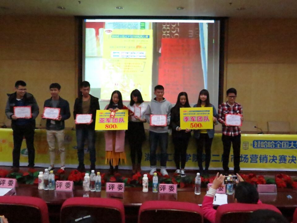 2016年11月17日晚7点,由388vip太阳集团化学化工学院和外国语学院联合主办的娃哈哈市场营销大赛决赛暨颁奖典礼在图书馆二报告厅举行。参与本次颁奖典礼的评委有化学化工学院学办主任吴菲、外国语学院团总支书记张婷、娃哈哈公司湘潭站负责人蒋海清以及化学化工学院与外国语学院的部分学生干部,本次比赛颁奖典礼由化学化工学院高分子1601班的李弼珺同学主持。