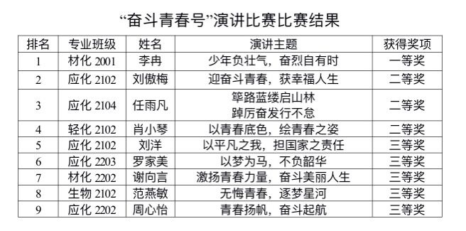 青春不是一种年龄,而是一种状态。青春是不断尝试,青春是永远奋斗在路上。演讲过程中,各位参赛选手或激昂澎湃,或低沉颂吟,或深情饱满,或激情澎湃,每一位选手都意气风发地站在台上完成了各有特色的演讲,富有感染力的神态动作和声情并茂的语言表达,配合着精美的演示文稿,打动了在场的评委及观众,台下不时爆发出一阵阵掌声。经过一个多小时的激烈比拼,最终,材料化学2001班李冉获一等奖。