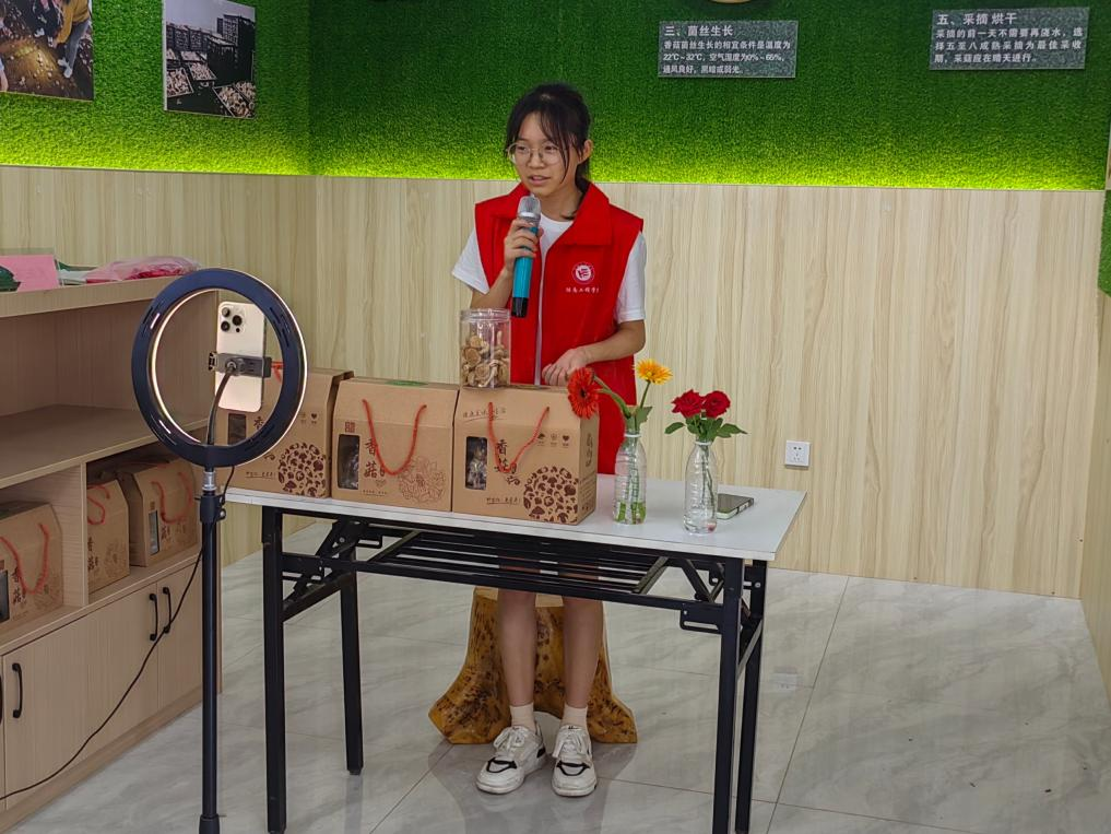 下午4点,志愿者们筹备已久的助农公益直播终于开播啦!志愿者们热情洋溢、轮番上阵向广大网友充分地介绍了基地概况、产品特色,直播间网友们积极留言互动,购买热情很高。据银田镇赵凯副镇长和银田寺社区沈进红书记介绍,银田村乡村振兴产业基地成立于2018年9月,是支村两委与全体村民共同努力,致力于壮大发展的村级集体经济,流转土地550亩,主要种植极具特色的灵芝、香菇、木耳、水稻等富硒系列农产品。灵芝、香菇产销两旺,与省水稻研究所合作种植超级水稻、绿色水稻200亩。产业基地现建有42个大棚、接种车间200平方米、菌棒生产车间2800平方米、遮阳棚16675平方米、200千瓦变压器一个、高温消毒车间4间、保鲜冷冻库2间。建有富硒大米深加工设备1套,仓储7间。基地为建档立卡贫困户17人提供就业岗位,均已实现脱贫,并已进行利益联结68户224人。银田村乡村振兴产业基地的建成,不仅帮扶了当地困难户,还大力发展了当地经济。