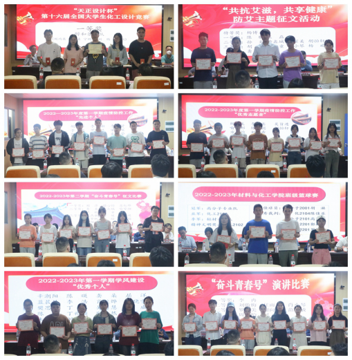 严明对受到表彰的先进集体和个人表示热烈祝贺,她激励同学们继续在学业、社会实践、科技创新、文体竞赛等方面,勤奋努力、锐意进取,为自己赢得更多的荣誉,为社会主义现代化建设注入强大的力量。张儒、罗荃分别宣读大学生化工竞赛和学生系列活动获奖名单。在场的领导嘉宾为在第十六届全国大学生化工设计竞赛和各类学生活动比赛中获得优异成绩的团队及个人颁发证书。付胜兵为全国大学生化工设计竞赛一等奖获奖团队颁发赞助奖金。