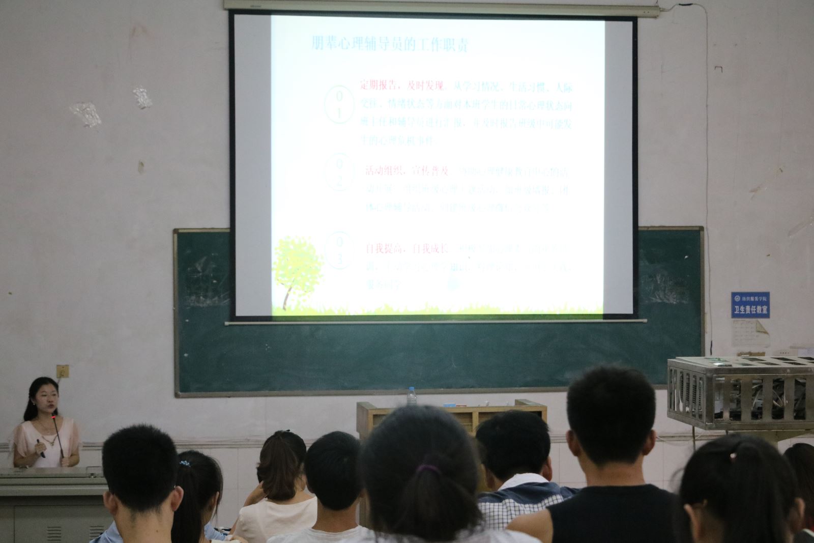 6月20日下午3点,化学化工学院在北校区电教105开展题为“朋辈辅导员心理干预”心理讲座。本次讲座由心理健康中心老师文梦雪主讲,化学化工学院心理专干易苏出席,各班级心理委员及寝室联络员积极参与。
