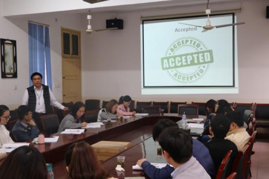 会议初,区教授向我们介绍了国际期刊的投稿准则以及国际上有名的期刊。紧接着,区教授告诫我们写论文时应该加强脑力、时间和精力的投入并保持积极努力的心态。随后,区教授向我们具体介绍了写论文时应该要呈现出完整的研究内容、研究思路等。由于一些主编只能接受文字的形式,区教授告诉我们不能只依赖word打字系统解决各种语言困难,加强手写文章的能力也很重要。最后会议尾声时,学生们积极的发言,并提出自己的疑问,区教授也一一解决了他们心中的困惑。