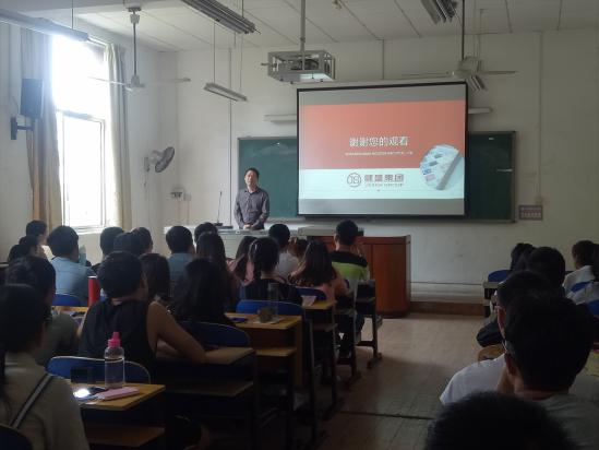 2017年5月4日下午两点半,健盛集团于388vip太阳集团红楼211举办招聘会,出席此次招聘会的有该公司董事长姜风、公司总经理戎祝均、化学化工学院学办老师刘思博,388vip太阳集团部分学生及纺织部分学生参加招聘会。此次招聘会主要面向纺织与化工专业的学生。会议由该公司总经理戎祝均主讲。