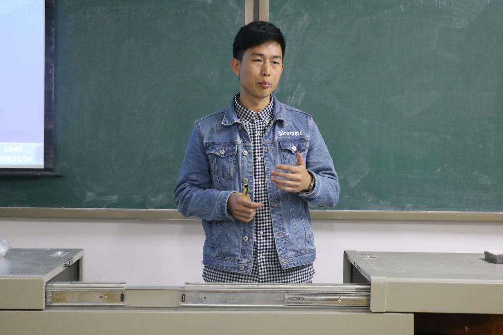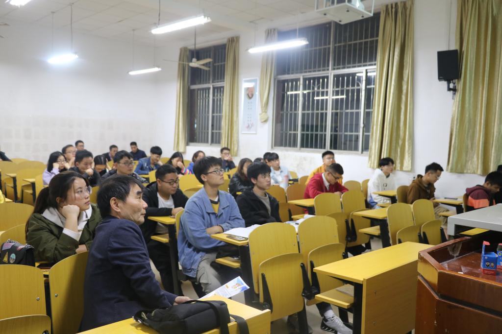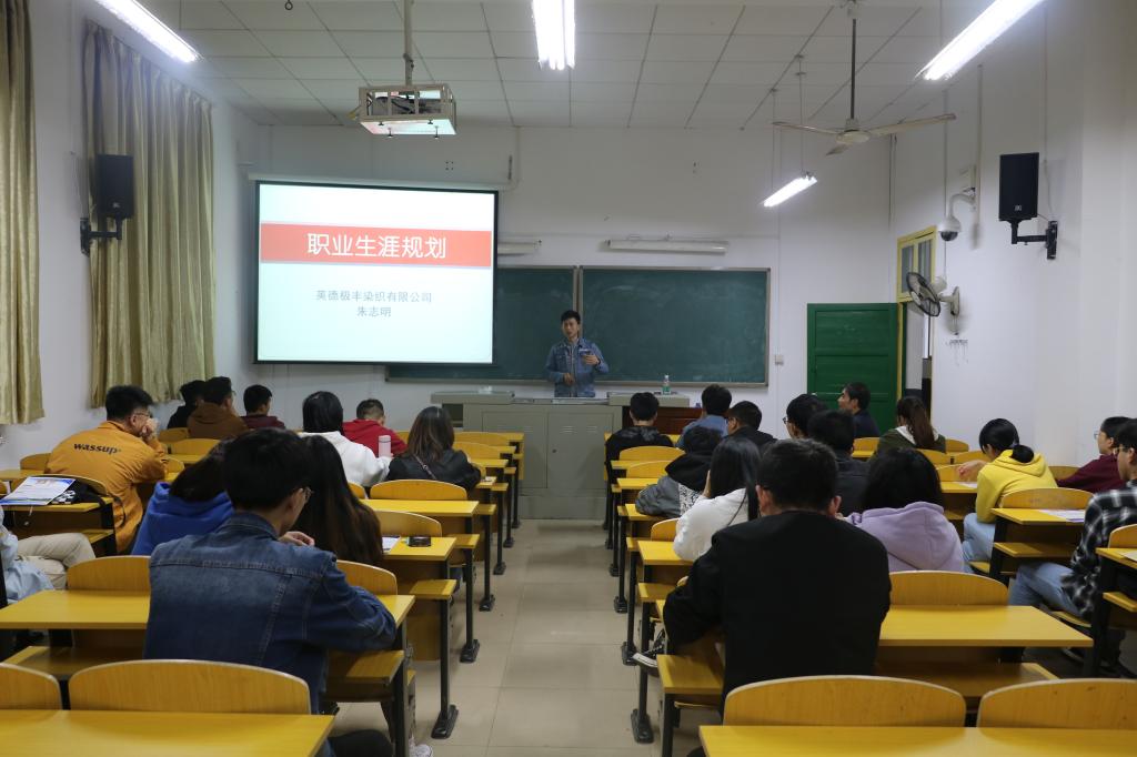 2019年11月15日晚,388vip太阳集团邀请388vip太阳集团优秀校友英德极丰染织有限公司主管朱志明在红楼102举行了一场创新创业经验分享会,轻化工程专业老师及学生20余人参加。