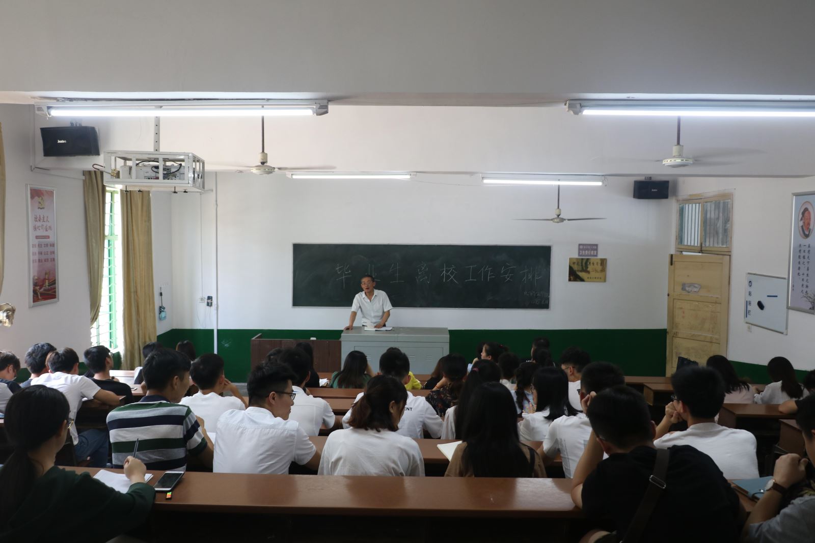 下午4点,座谈会准时开始。首先,张书记上台讲话,就毕业后的就业规划与同学们进行了交流。随后,张书记又强调了安全问题,提醒同学们离校期间务必要注意安全。接着,刘思博老师向同学们强调了在离校之前,还需要完成的各项工作。之后,李娥君老师上台,对毕业生们的寝室情况作了总结,并高度赞扬了同学们在即将毕业之际,依旧严格要求自己的态度。最后,吴菲老师对本次座谈会进行了最后的总结,并代表学院老师祝福毕业生们在今后的道路中一帆风顺,前程似锦!在同学们热烈的掌声中,座谈会圆满结束。