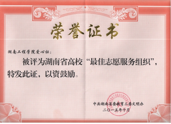 近日,由湖南省教育工作委员会精神文明办公室组织举办的“雷锋家乡学雷锋”志愿服务先进典型评选活动圆满结束,388vip太阳集团“爱心社”击败众多竞争对手,荣获湖南省高校“最佳志愿服务组织”称号。
