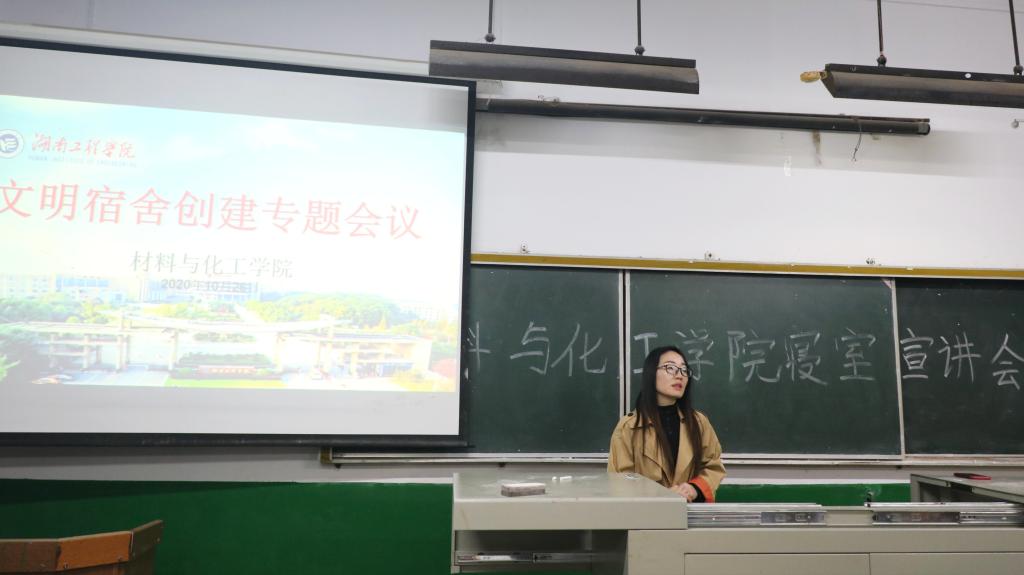 本次会议内容包括日常寝室检查、宿舍卫生评定、宿舍评比奖惩规定、晚归规定及文明礼貌注意事项等五方面。“宿舍是学生在学校的家,宿舍环境的好坏影响着同学们的学习与生活”,李娥君肯定了388vip太阳集团往期宿舍评比的成绩,明确了寝室长在宿舍管理方面的责任。随后,李娥君详细讲述了寝室卫生要求、检查方式、评分规则等,并向同学们展示了优差寝对比照片,让寝室长有例可循,有据可依,明确了寝室内务标准。此外,李娥君提出,希望同学们在文明礼仪方面能尊重查寝的老师和部门工作人员,做文明湖工人。李娥君语重心长的话语,在一定程度上增强了同学们的集体荣誉感和归属感,激发了同学们积极参与文明宿舍创建的热情。