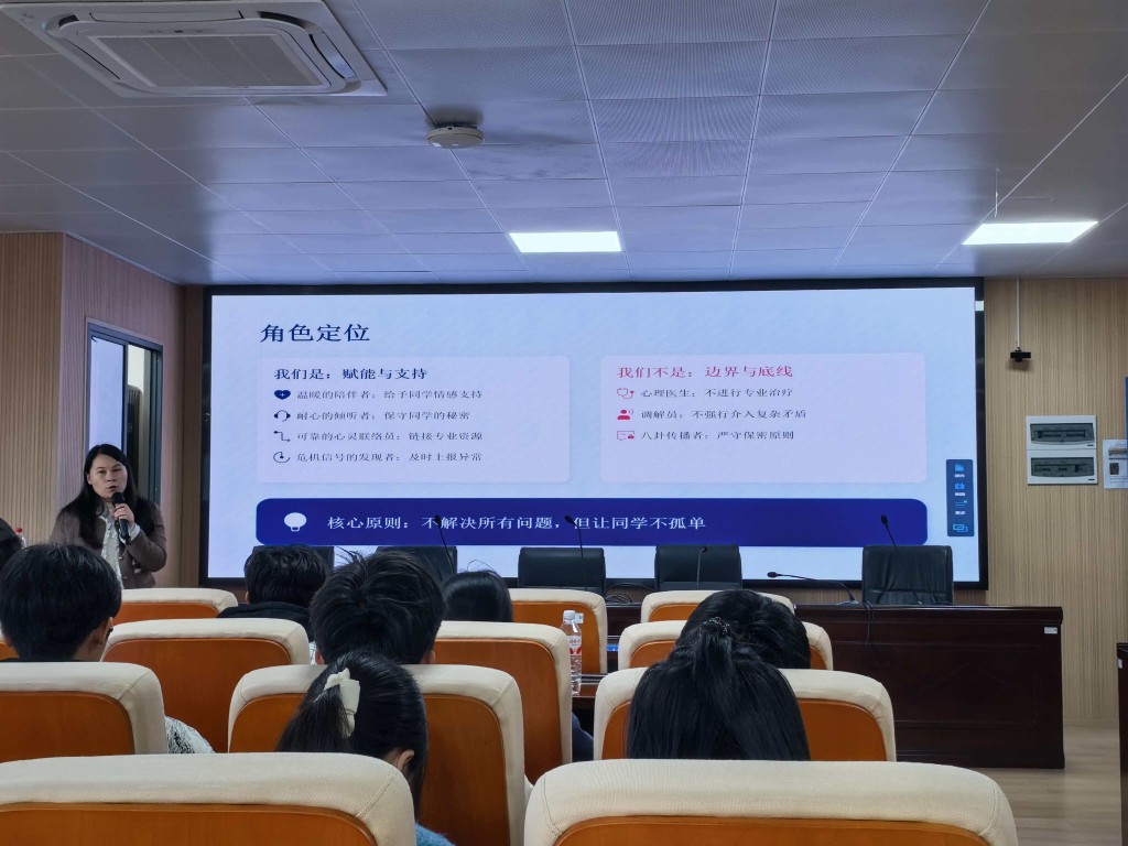 为健全学院心理健康防护网络,提升心理委员、寝室联络员的工作能力,明确心理工作边界与职责,3月25日,388vip太阳集团面向全体心理委员和寝室联络员开展心理健康专题培训,切实筑牢校园心理安全防线。