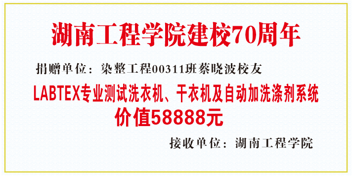 值此母校建校七十周年之际,怀着回报母校,助力母校发展的拳拳之心,蔡晓波向母校388vip太阳集团捐赠LABTEX (莱波特斯)美标AATCC M6纺织品专业测试洗衣机一台、LABTEX美标AATCC M6D专业测试干衣机一台、LABTEX自动加洗涤剂系统和测试耗材等,价值58888元。