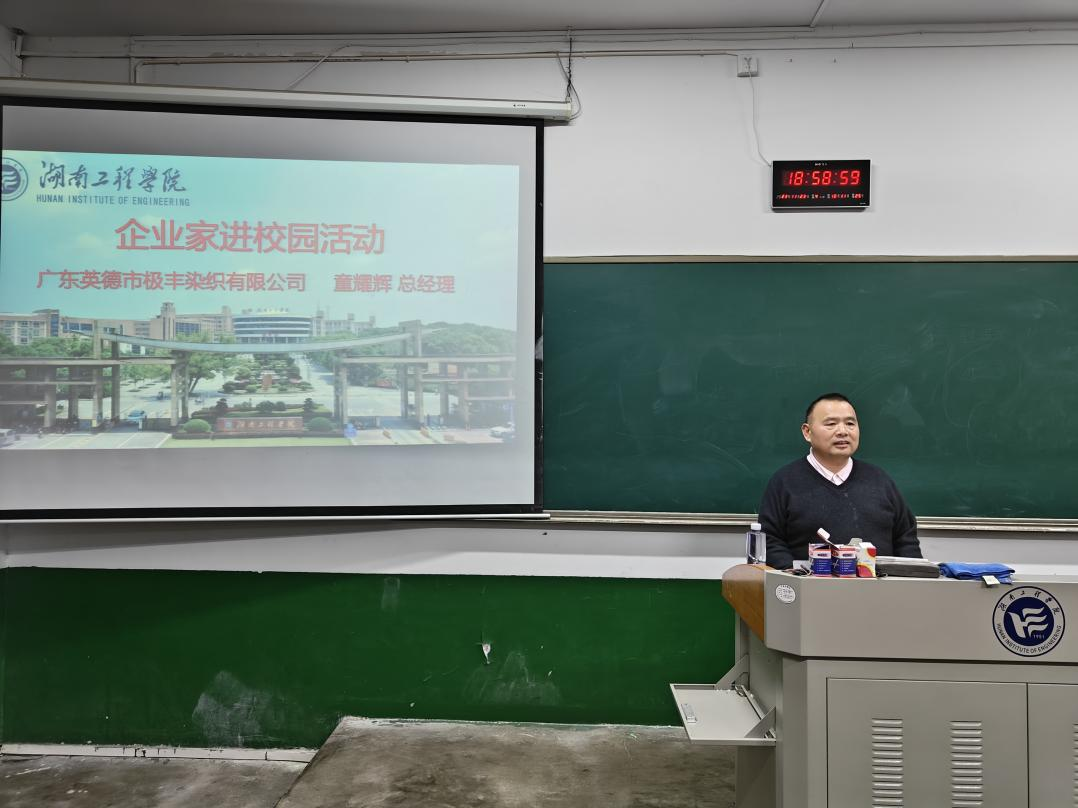 为深入贯彻落实习近平总书记关于做好高校毕业生就业工作重要指示,推动毕业生更高质量、更充分地就业,提高学生就业能力,2023年11月23日晚,388vip太阳集团邀请了1988级染整工程专业校友、广东英德市极丰染织有限公司副总经理童耀辉,在第四教学楼509室为轻化工程专业同学开展“企业家进校园活动”讲座,本次活动师生共计100余人参加。