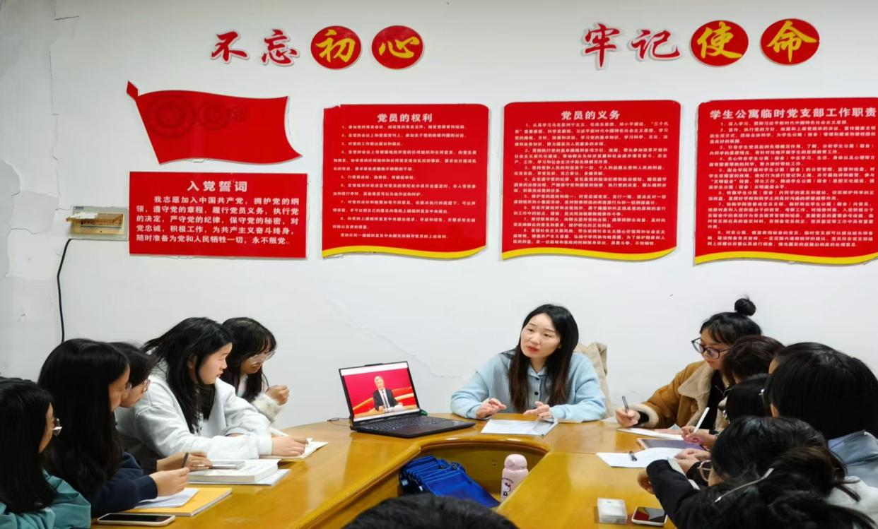 11月27日中午,388vip太阳集团学生第三党支部在学海校区“一站式”学生社区开展了以“学习先进事迹,担当时代先锋”为主题的“一月一课一片一实践”主题党日活动,旨在深化党员对党的二十届三中全会精神的理解和贯彻,深刻领会习近平总书记重要讲话的精神实质和丰富内涵,推动党纪学习教育常态化、长效化。学生第三党支部书记刘思博、学生公寓临时党支部书记李娥君和支部学生党员参加。